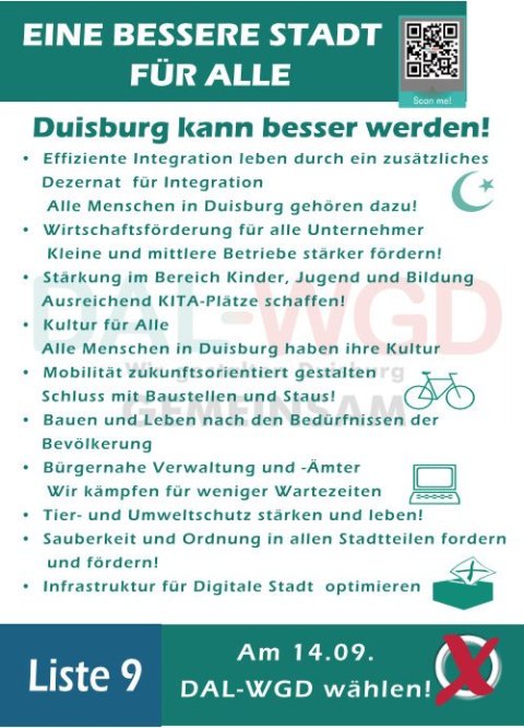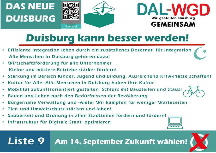 Als Wählergemeinschaft, die aus engagierten Bürgern dieser Stadt besteht, wissen wir was in Duisburg getan werden muss. Dazu stellen wir uns am 14. September 2025 zur Wahl. Wählen Sie DAL-WGD, Liste 9, wenn Duisburg eine Chance auf Erneuerung bekommen soll.